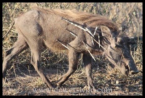 Near Satara, this warthog obviously had an altercation with a porcupine – we suspect it may have rushed into an already occupied bolthole a little too quickly!