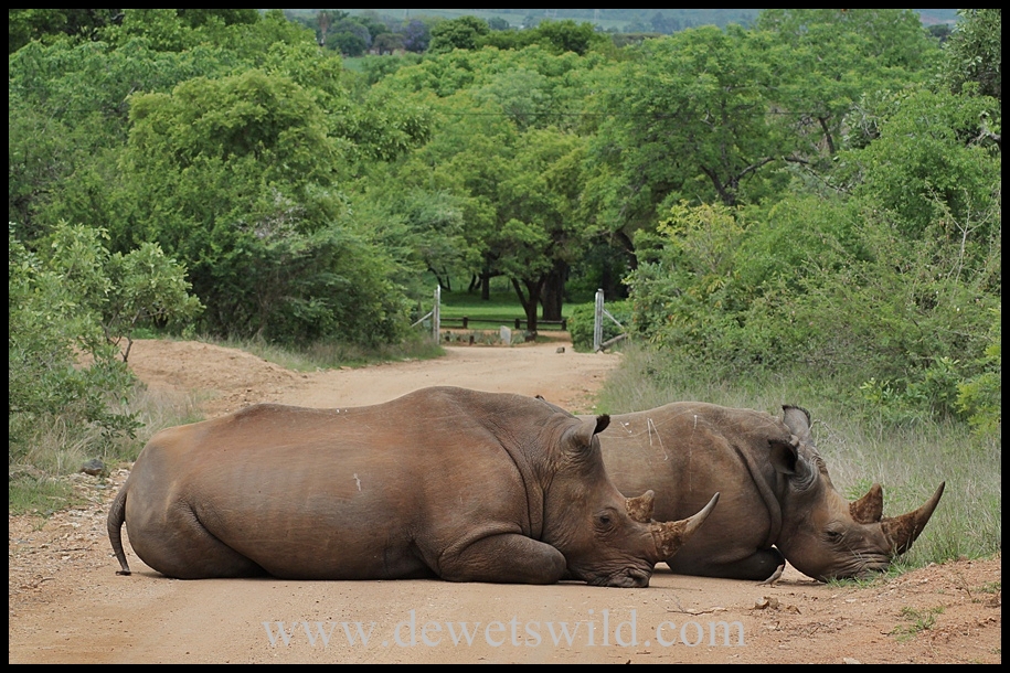 It’s because of situations like these that the Kruger National Park is the place we escape to so regularly. On arriving this morning, these two white rhinoceroses blocked our way into the rest camp (the gates of which you can see just behind them)!