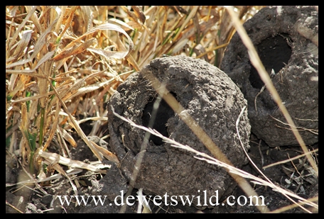 Dung beetle balls dug up by a ratel (honey badger)