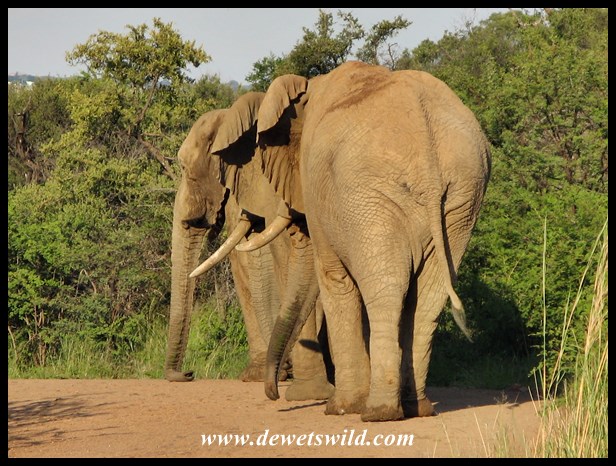 African Elephant (2) ← Previous Next → Three big bulls walking in single file along a road in the Pilanesberg