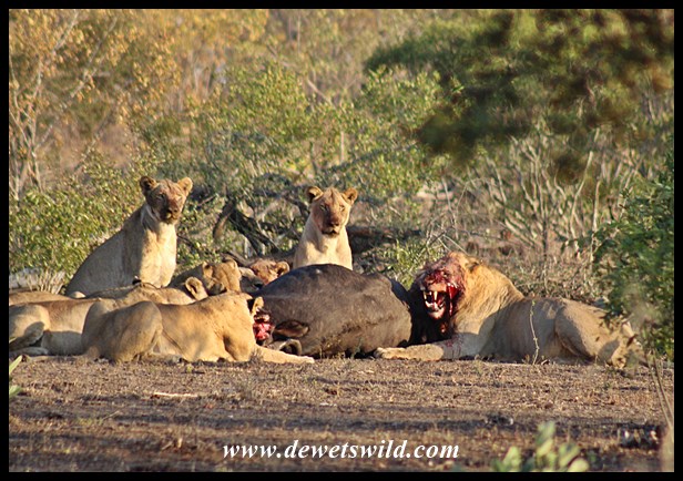 Lion pride with buffalo kill