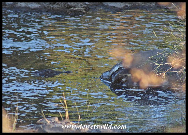 Drought Hippos (3) ← Previous Next → Crocodile feeding on hippo carcass in the Nwanetsi River near Satara