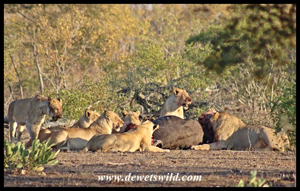 Lion pride with buffalo kill