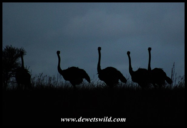 Ostriches silhouetted against dark skies