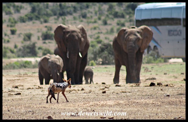 Jackal facing up to an elephant family at Hapoor