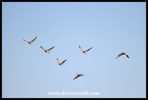 Pink-backed Pelicans in flight over Nsumo Pan
