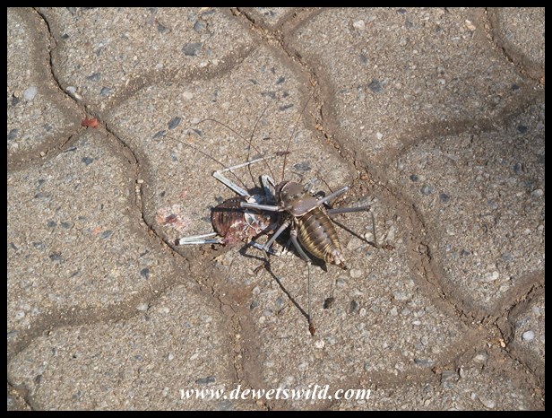 Satara April 2017 (5) ← Previous Next → There seemed to be armoured crickets everywhere you looked! This one was feasting on a trampled comrade in Satara’s parking area…