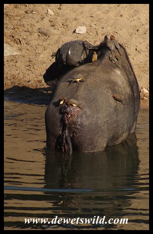 Red-billed Oxpeckers pecking at an open wound on a buffalo