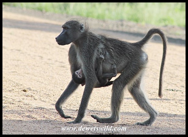 Young Baboons hang from their mother’s tummy