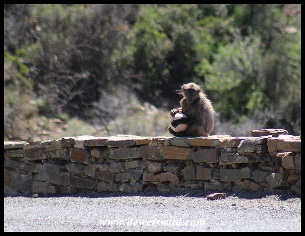 Karoo NP December 2017 Baboon (88) ← Previous Next → Baboon clutching an ornamental ostrich egg stolen from the camp