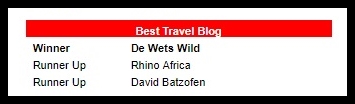 Best Travel Blog ← Previous de Wets Wild was voted Best Travel Blog in the 2017 South African Blog Awards