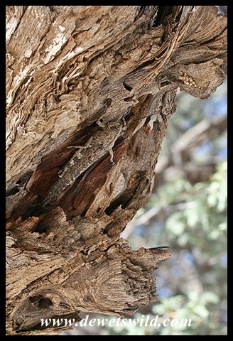 Camouflaged Tree Locust against a tree trunk