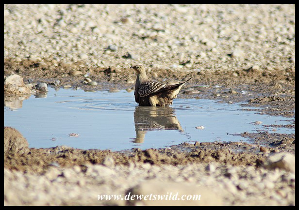 Kgalagadi_Jun2018_NamaquaSandgrouse (108) ← Previous Next → Namaqua Sandgrouse wetting his feathers to take water back to its chicks at the nest