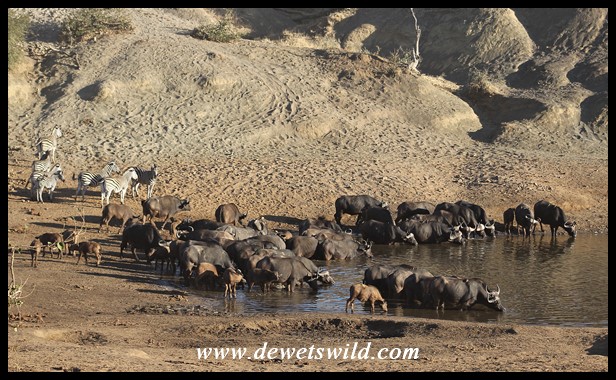Buffalo_Kruger_15Jun2019 (27) ← Previous Next → Buffaloes slaking their thirst while zebras wait their turn
