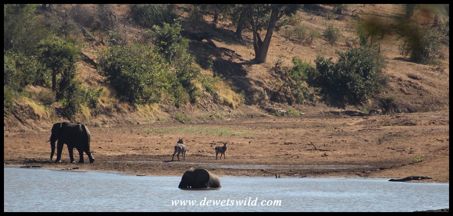 Elephant_Kruger_16Jun2019 (18) ← Previous Next → Elephants and waterbuck at a deep pool in the otherwise dry Shingwedzi