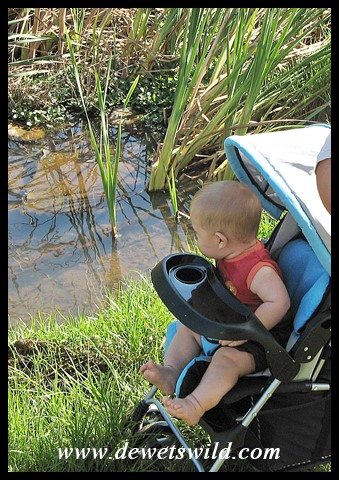 2010-03_Moreletakloof ← Previous Next → 7 Months old: March 2010. Off-roading pram along the Rademeyer Spruit in the Moreletakloof.