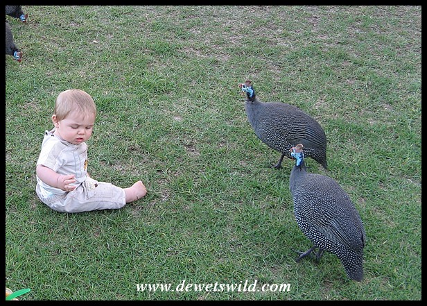 2010-05_Wilderness ← Previous Next → 9 Months old: May 2010. Surrounded by Guineafowl in the rest camp at Wilderness in the Garden Route National Park.
