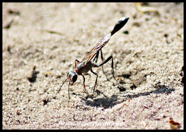 Thread-waisted Wasp closing up the nest-burrow