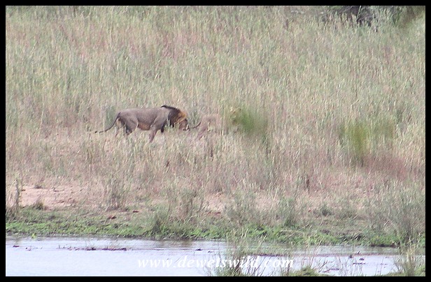 SabieRiverLions_Sep19 (5) Next → Male and female lion walking the river bed in front of Lower Sabie Rest Camp