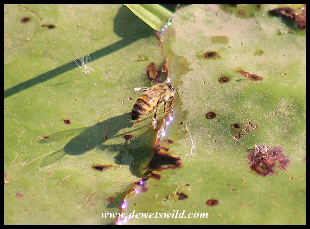 Moreletakloof_4March2019_HoneyBees (2) ← Previous Next → Honey Bee drinking from a puddle on a lillyleaf