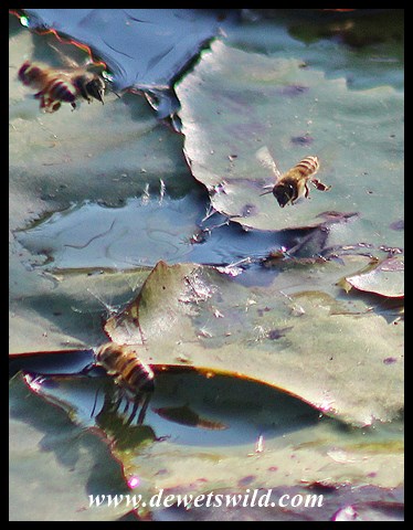 Moreletakloof_4March2019_HoneyBees (3) ← Previous Next → Honey Bees drinking from a puddle on a lillyleaf