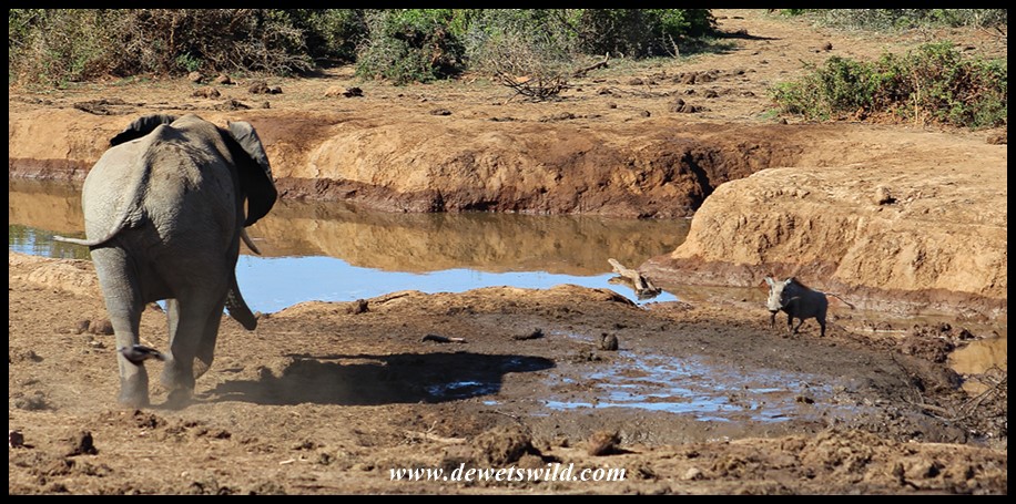 _Addo_29Dec20 (41) ← Previous Next → Elephant mock-charging a nervous warthog at Marion Baree waterhole