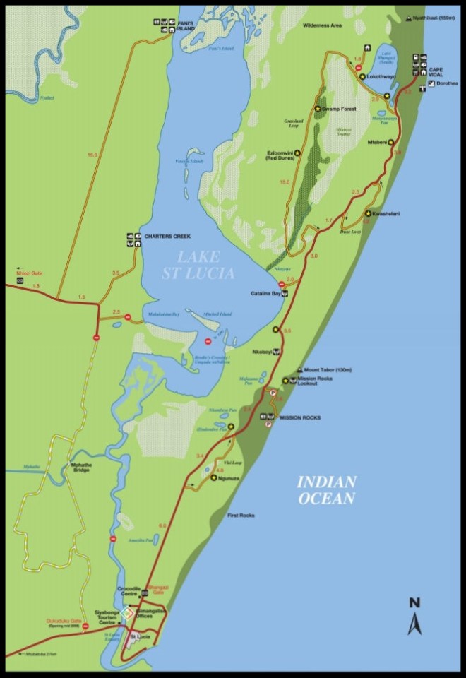 Eastern Shores ← Previous Next → Map of the eastern shores section of the iSimangaliso Wetland Park (from https://isimangaliso.com/)