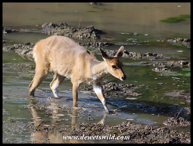 Bushbuck ewe crossing the shallows of Tlopi’s dam