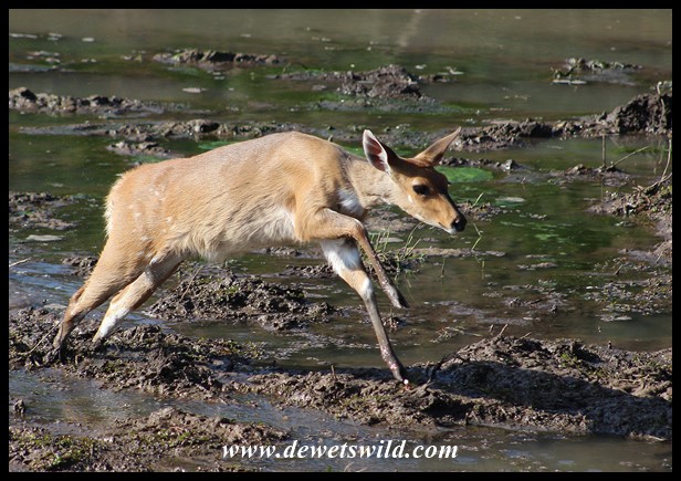 Bushbuck ewe crossing the shallows of Tlopi’s dam