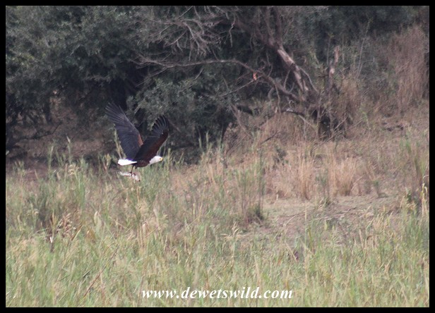 KNP_16Aug21_JdW (42) ← Previous Next → Now with its composure regained, the Fish Eagle sets off for a favourite perch (photo by Joubert)