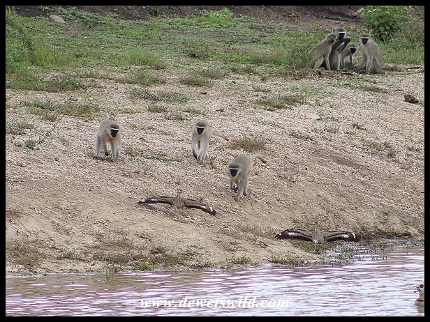 Standoff between Vervet Monkeys and Water Dikkoppe (Water Thick-knees) at Mazithi Dam. In the top right-hand corner of this image you can see some of the troop snacking on the Dikkop eggs.