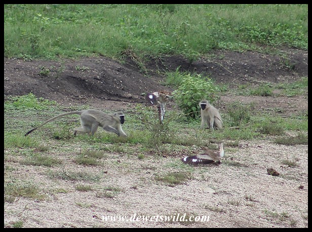 Vervets-v-Dikkops_KNP_19Dec2021_Dries (54) ← Previous Next → Standoff between Vervet Monkeys and Water Dikkoppe (Water Thick-knees) at Mazithi Dam