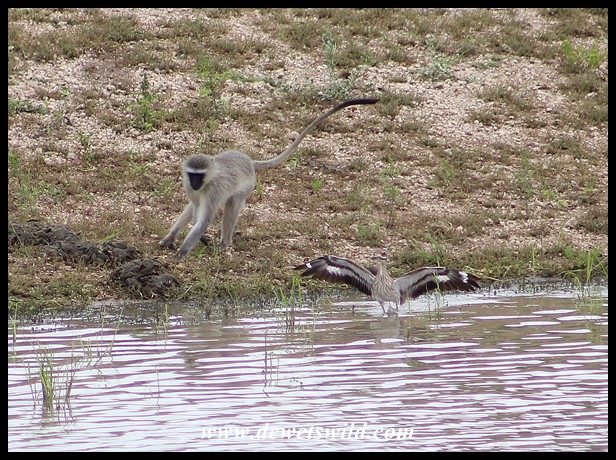 Vervets-v-Dikkops_KNP_19Dec2021_Dries (67) ← Previous Next → Standoff between Vervet Monkeys and Water Dikkoppe (Water Thick-knees) at Mazithi Dam
