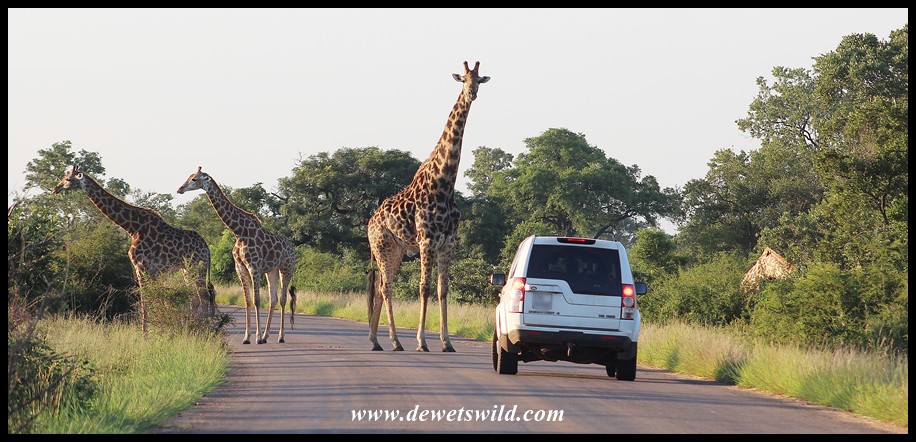 Towering Giraffe roadblock on the way to Tshokwane