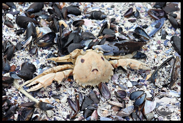 ShellDebris_WestCoast_Dec2022_DdW (141) ← Previous Next → Mussel shells and a dead crab that was deposited on the beach at Tsaarsbank