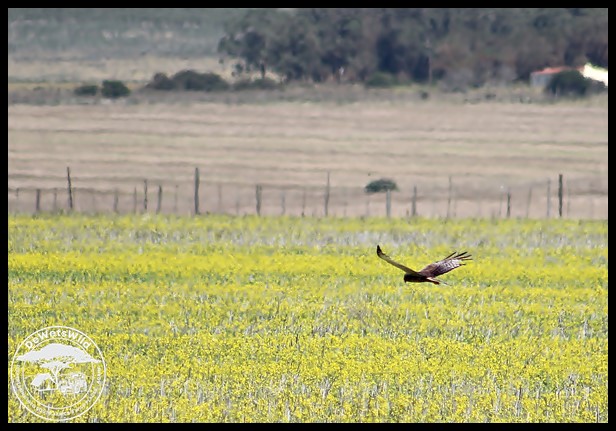 African Marsh Harrier coursing over a canola field