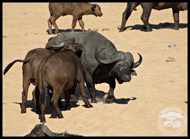 Buffalo_KNP_Jun23_DdW (2) ← Previous Next → Two young Buffalo bulls currying favour with a very commanding mature bull