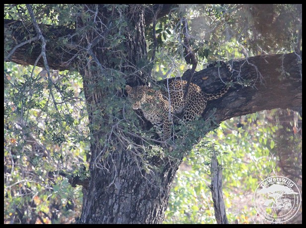 Leopard in a tree on the bank of the Tsendze River south of Mopani