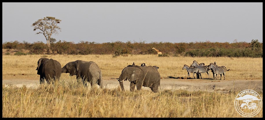 IMG_2717 ← Previous Next → Elephants, plains zebras and a giraffe around one of the springs in the Nshawu Marsh