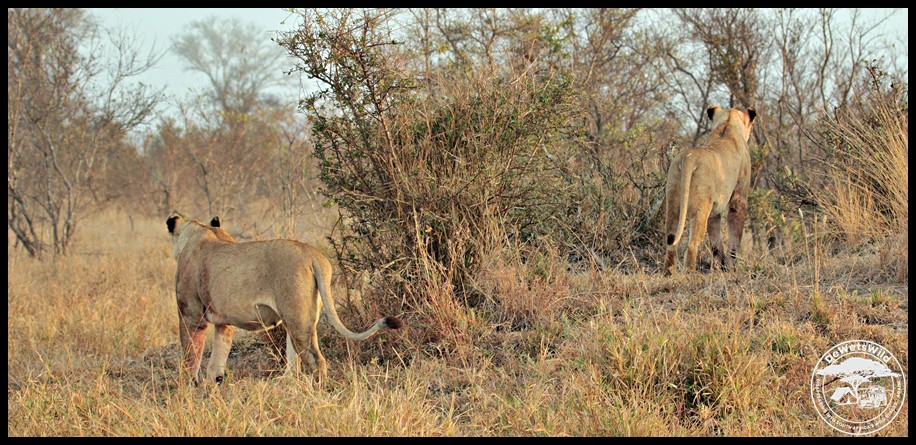Two lionesses settling on a termite mound in the Manyeleti