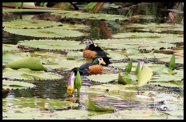 African Pygmy Geese among Blue Water Lilies