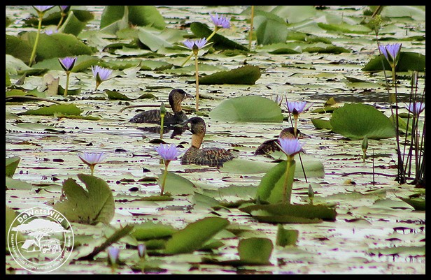 White-backed Ducks among Blue Water Lilies