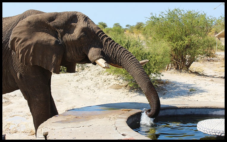 Elephant drinking from the pool at Elephant Sands’ Eco Lodge