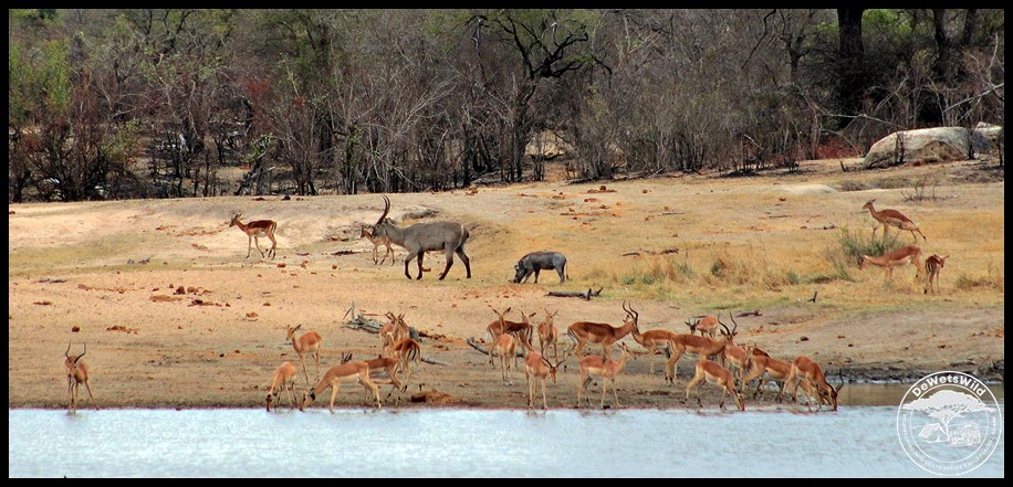 Waterbuck, impala and warthog mingling on the banks of Transport Dam