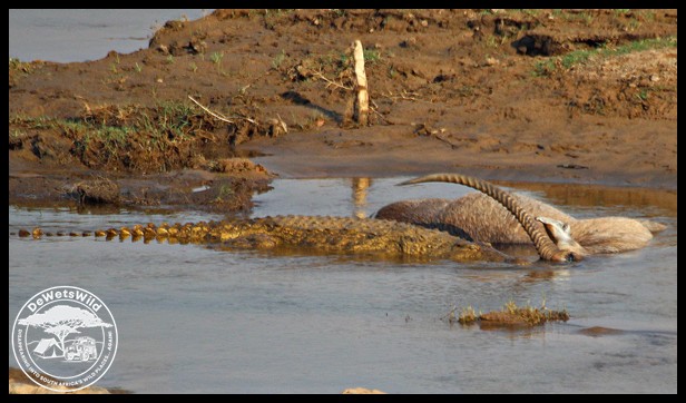 On a recent tour of the Kruger National Park my guest and I were treated to this amazing sighting. We were following the course of the Olifants River when we saw a downed Waterbuck bull splashing in shallow water. How the Waterbuck ended up there is open to speculation, though it appeared to have a wound in its stomach and one of the other bulls standing on the riverbank might have had something to do with that. In any event the Waterbuck was not able to get back up and it didn’t take long for its splashing to attract a Nile Crocodile. It was extremely interesting to see how gingerly the Crocodile dealt with the Waterbuck, even after the antelope drowned itself, and this is likely due to the distasteful oily secretions that covers its coat.