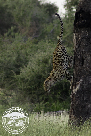 Leopard leaving the marula tree