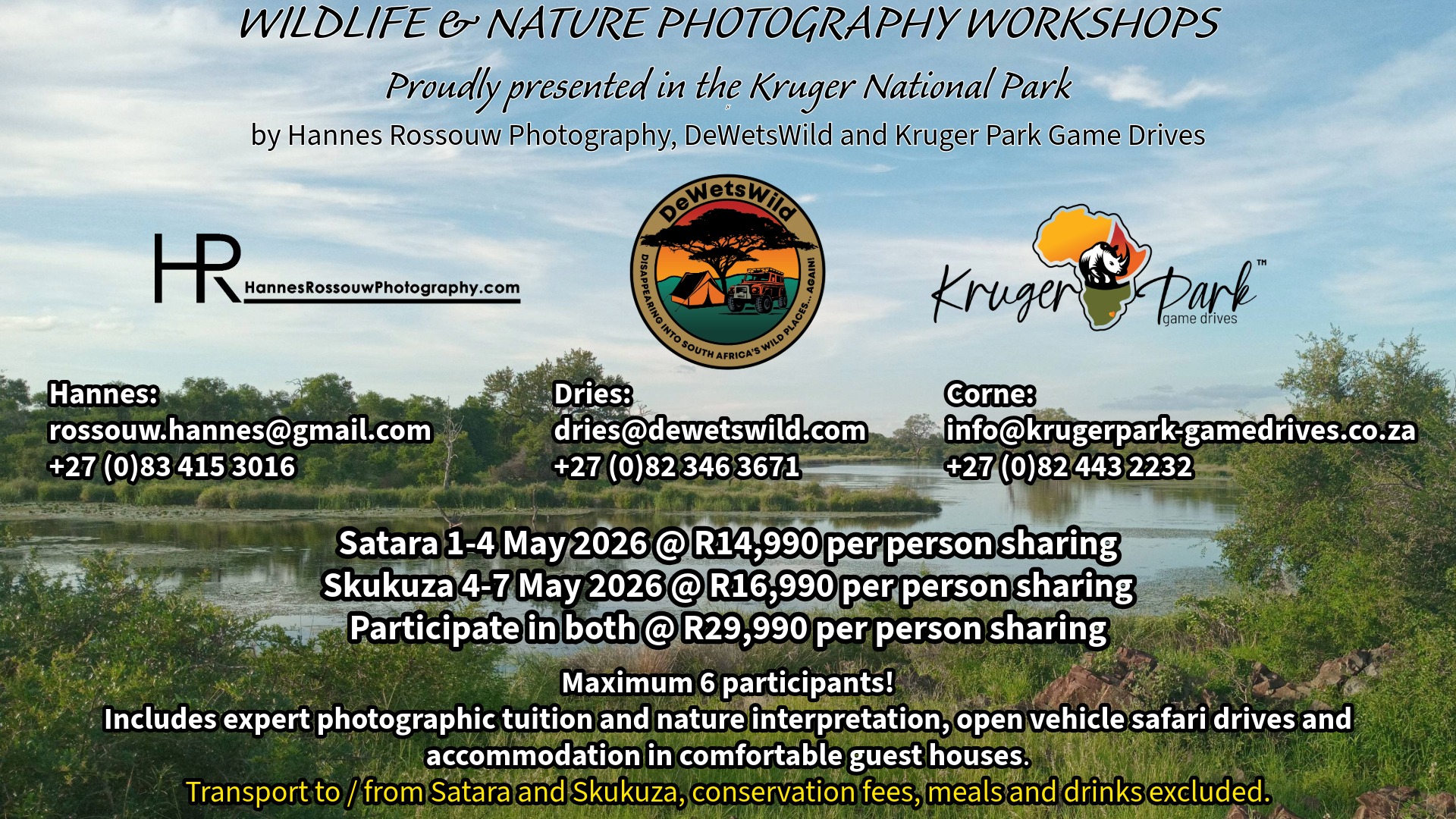Our next nature photography workshops in the Kruger National Park take place early in May 2026 – one at Satara and one at Skukuza. We still have a few spots open, so don’t hesitate to reach out to us if you’d like to take part!