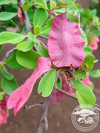 These attractive seedpods belong to the Purple-pod, or Lowveld, Cluster-leaf, a densely branched shrub or small tree that is found in our Limpopo and Mpumalanga provinces. It proliferates in clay-like soils, often in rocky areas next to large rivers, and is heavily used by browsing animals.