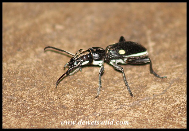 The Two-spotted Tyrant Beetle is a large carnivorous insect about 5cm in length. They’re active by day and ferocious predators of other insects, using their strong mandibles to great effect. These beetles are found in a wide range of savanna and grassland habitats in all South Africa’s provinces and are also known locally as Oogpisters (“oog” being Afrikaans for eye, and the rest you can probably deduce from context) for their ability, shared with many other members of the genus, to spray a jet of formic acid with great accuracy up to 30cm far, this being potent enough to cause blindness in mammals and birds that attack the beetle.