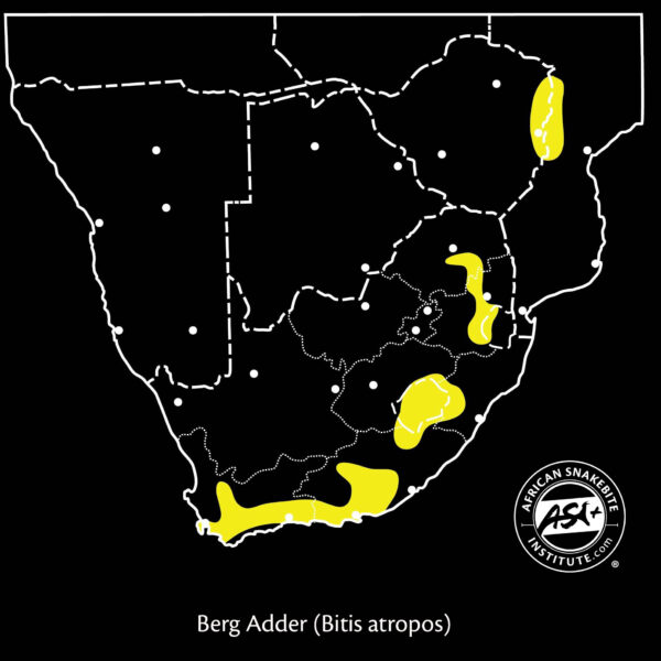 The Berg Adder, or Mountain Adder, is a smallish viper restricted to the mountain ranges of South Africa’s southern coast, the Drakensberg range on the border of Lesotho and Kwazulu-Natal province, the escarpment of Mpumalanga and Limpopo and the mountains on the border between Zimbabwe and Mozambique. They prefer relatively open montane heathland and grassland on mountains in high rainfall areas and may be found from sea level even to the crests of our highest peaks. They feed on a variety of amphibians, reptiles and small mammals and birds.